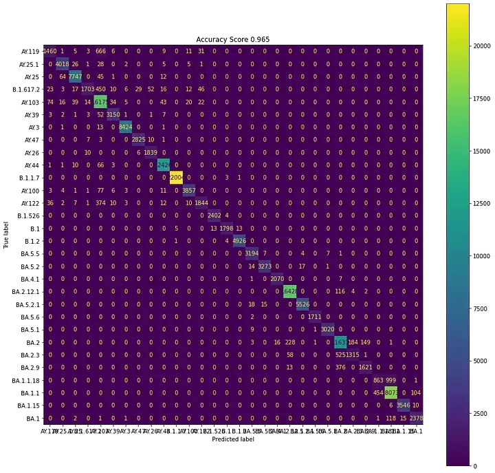 Furthermore, small fragments can also be used to classify SARS-Cov2 lineages. The top 30 most reported variants can be classified with fragment frequency information with around 95% accuracy. This small model can offer an alternative for variant classification. And can be easily scalable to an even larger number of sequences and variants.