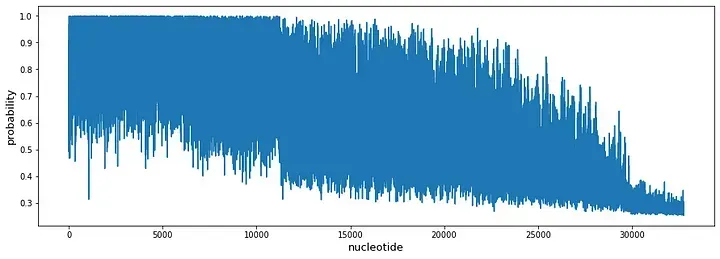 Confidence in full-length sequence prediction lowers as the sequence approaches more variable regions. Low probabilities show that the model is not able to confidently predict the most likely nucleotide. This could be due to poor model performance or the need for additional information to increase precision. Expanding the dimensionality of the encoding could help to bring closer together different sequence regions that are far away. Or could also mimic the 3D structure of the genome making it easier for the network to understand the data.