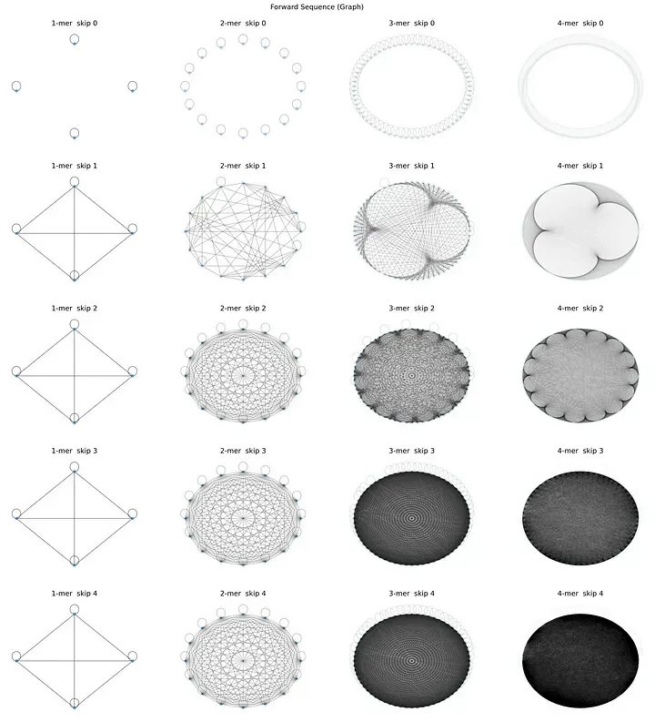 If the sequence is fragmented into 4-size elements and a sub-fragmentation of 2-size sub-fragments without overlaps, then there are 16 different combinations of nucleotides. This graph can be represented as an adjacency matrix leading to a 16x16 array. Then the sequence is fragmented into 16 non-overlapping fragments leading to a 16x16x16 array. This new encoding captures a part of the location information and allows the information to be closer by expanding the number of dimensions of the encoding.