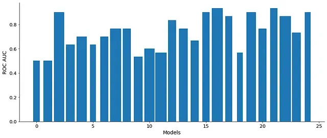 With the index created, we calculate the new features from the index, then and process the new features to be used to train a random forest classifier. We train a min-max scaler from the skleran library and split the new data for training and testing, Finally, we train a random forest classifier from the sklearn library using the default parameters and calculate the ROC AUC as a measure of performance.