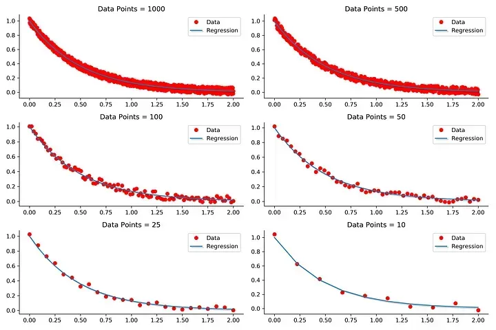 Data acquisition is usually constrained by several factors that can diminish the number of data points that we are able to obtain. We can evaluate the impact of data acquisition by changing the number of data points that we generate. Using a similar strategy as described above we can observe that the absolute error of the estimation is around the same between 1000, 500,100, and 50 data points.